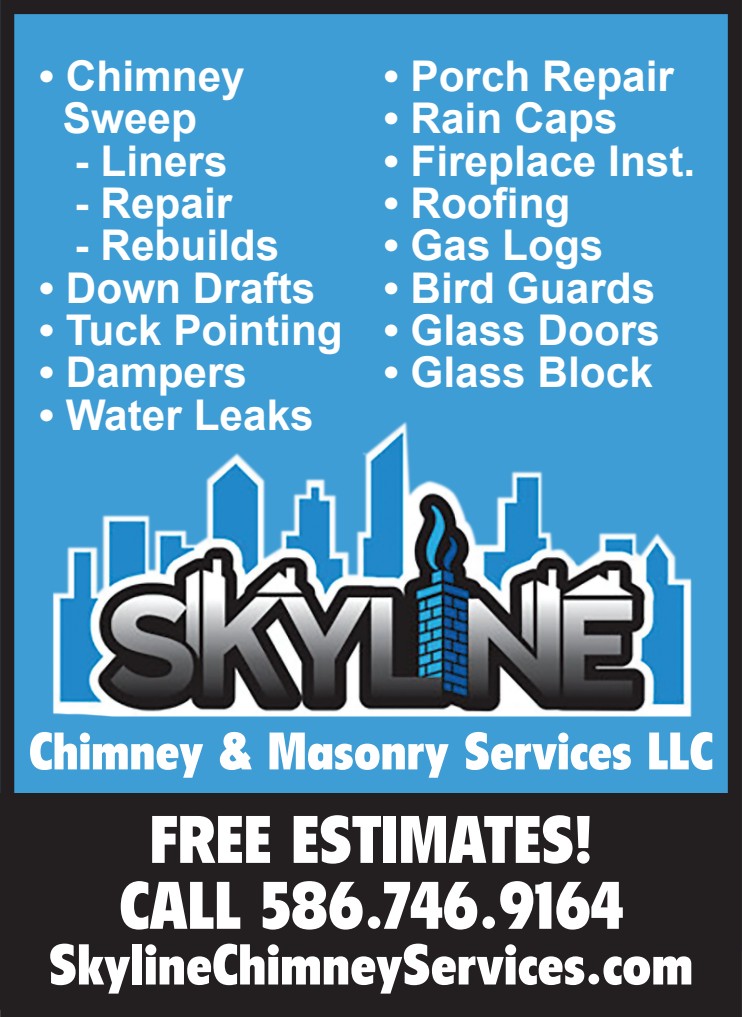 Free Estimates! Chimney Sweep, Liners, Repair, Rebuilds, Down Drafts, Tuck Pointing, Dampers, Water Leaks, Porch Repair, Rain Caps, Fireplace Inst., Roofing, Gas Logs, Bird Guards, Glass Doors, Glass Block